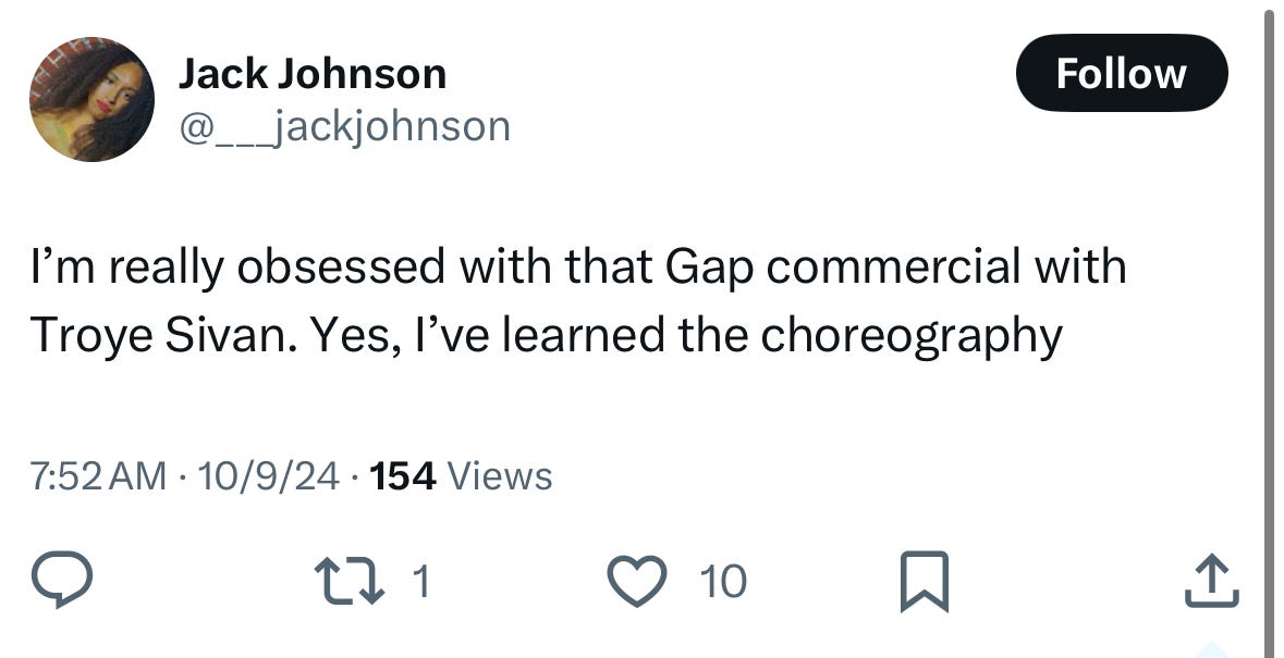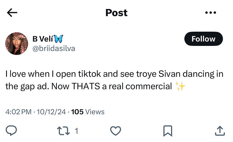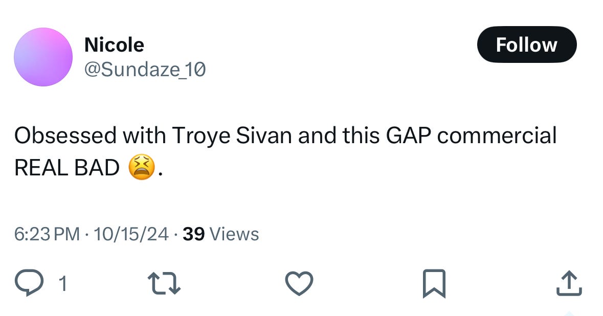 In August, Gap released their Get Loose campaign featuring singer Troye Sivan on TikTok and its audience resonated remarkably with the ad. On X, may users admit their obsession to the ad, admitting the choreography mixed with the music left a lasting impression. Many users on Tiktok have started the trend to dance to the audio following the artist’s choreograhpy.