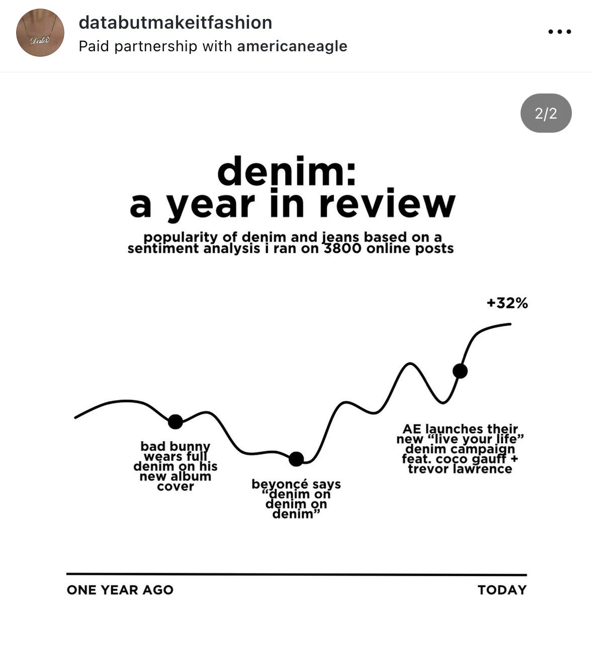 According to Instagram account, @databutmakeitfashion, trends are showing denim has increased in popularity since artists and celebrities have been embracing the fabric through their music and campaigns.